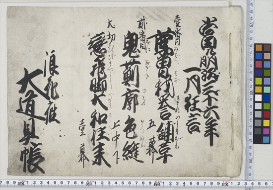 當ル明治三十六年一月狂言 壱番目 莩曽我誉舗革 五幕 弐番目 鬼薊廓色縫 上中下 大切 恋飛脚大和往来 壱幕 浪花座 大道具帳
